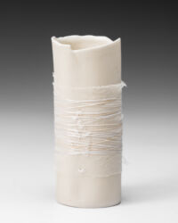 Light Vapours of Dawn continues my practice of examining notions of memory, family history and cultural connection through vessels made from two materials, porcelain and repurposed cloth and thread. This focus exhibition presents an opportunity to explore possibilities for new and more direct conversations between my two materials, using a 100-year-old camisole belonging to my mother.