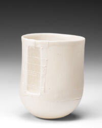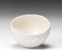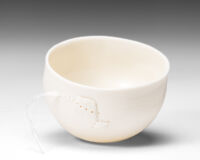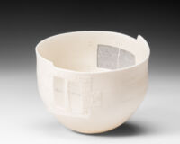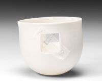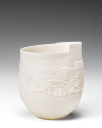 Made of cotton net with a lace border, this garment has spiritual significance for my mother. Called a sudreh, the camisole is central to my mother’s ancient Persian religion and is worn daily, closest to the skin. Usually sewn from fine cotton muslin (mulmul), cotton net sudreh were worn on special days and given as gifts at weddings and feast days. This camisole was given to my mother by her mother, at one such occasion. By repurposing the net and fixing the fabric to the vessel wall, I am making visible and giving new prominence to cloth that till now has been concealed and covered. Giving it a new life allows me to share the story of its journey and its significance. It is imbued with memories of people and place and opens conversations about family gatherings and shared times, about rituals and practices. Within its fibres reside narratives of who I belong to and where I come from. Brought together through my process, the porcelain and textile vessels serve as memory-keepers, a powerful holding space of ancestral history and cultural tradition.
